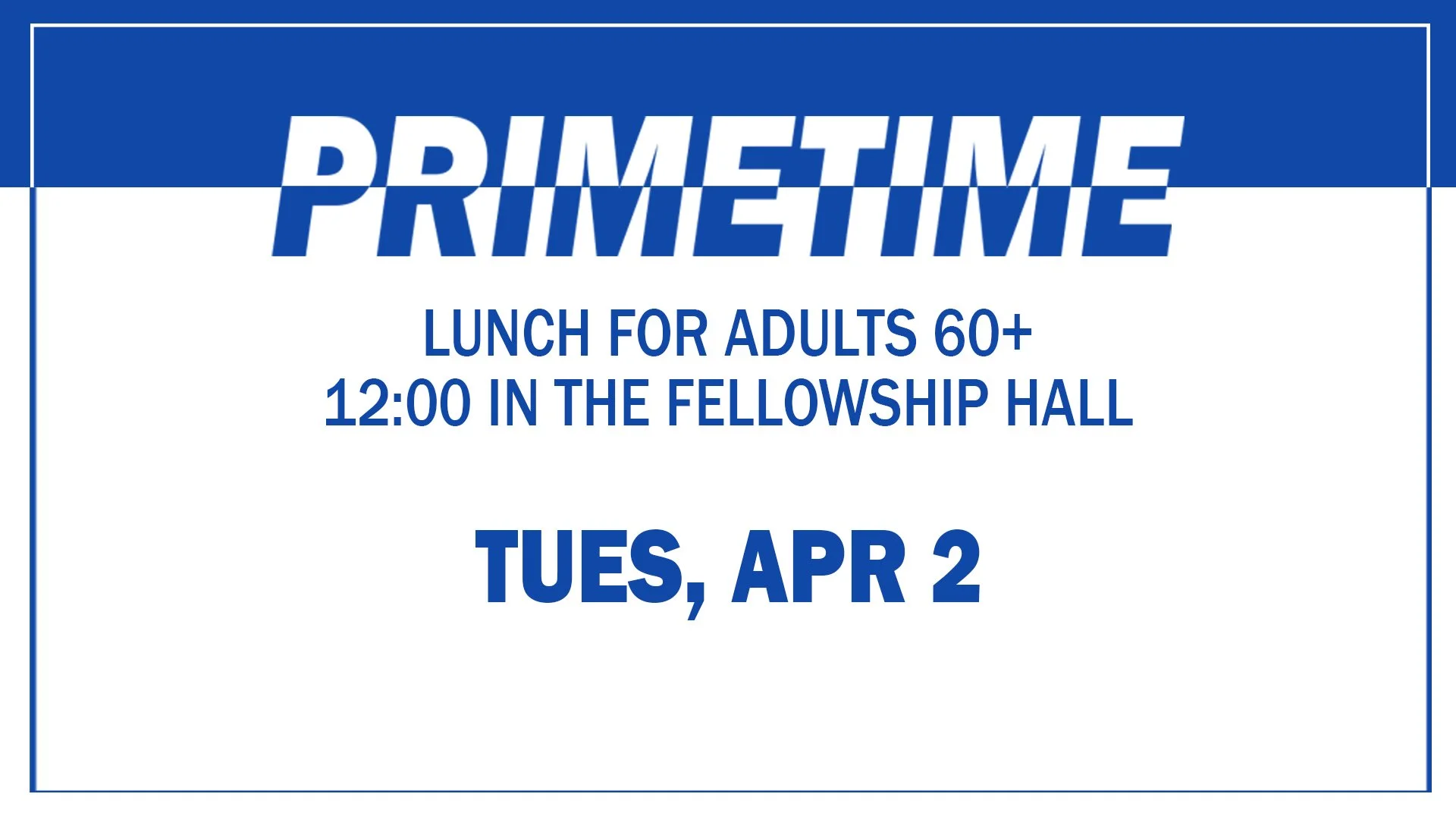 Apr 2 | PrimeTime Lunch at 12:00pm, for those 60+